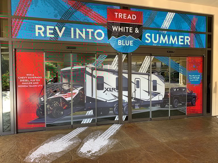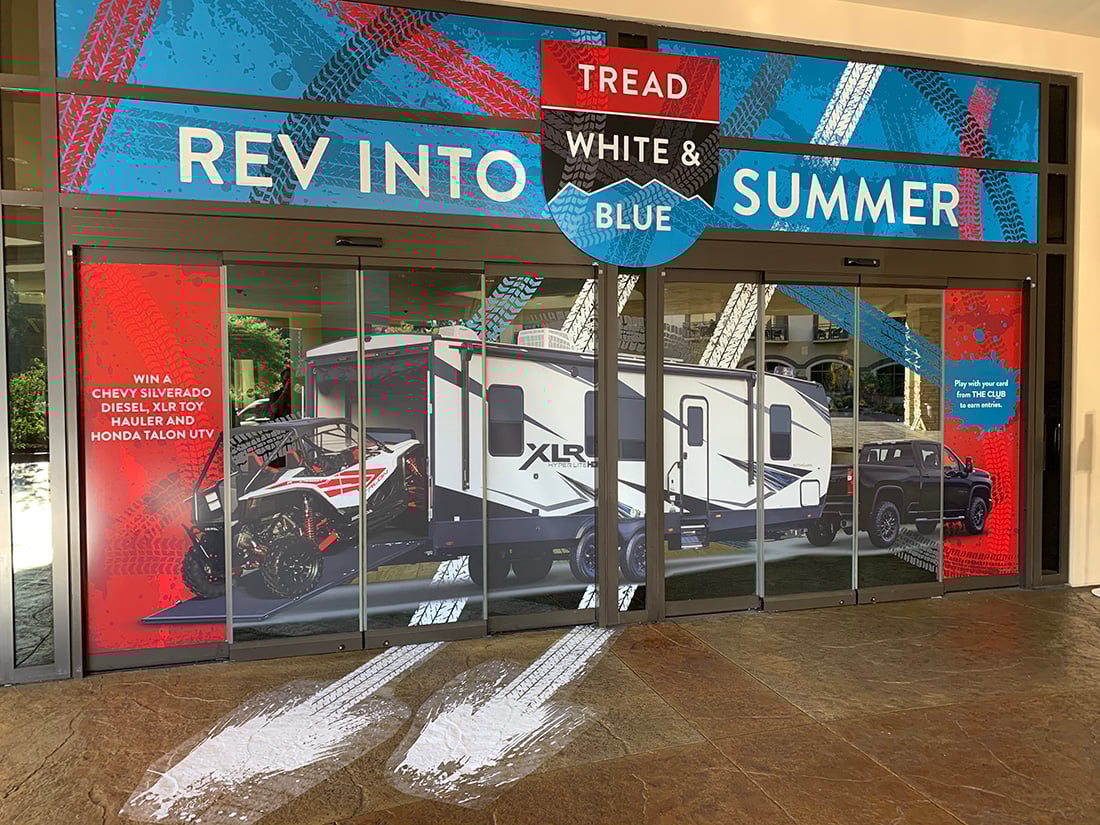 With prizes including a brand new Chevy Silverado, a Honda Talon ULV, as well as a massive XLR Toy Hauler, it’s safe to say Chumash is ready to offer their guests an enthusiastic and warm welcome as they return to the floor. To celebrate the summer giveaway, we helped transform the interior and exterior of the Casino, keeping with their “Tread, White, and Blue” theme.
